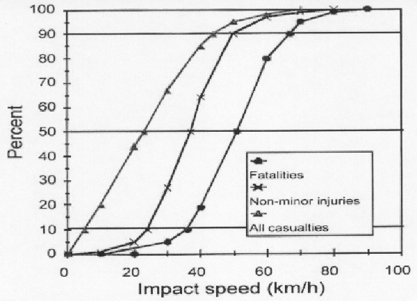 L’évaluation des risques en fonction de la vitesse d’impact pour les chocs frontaux entre véhicules (à ne pas confondre avec la vitesse de circulation) reprend des données bien établies dans la littérature accidentologique. A 30 mph le risque est trois fois plus élevé qu’à 20 mph et il est cinq fois plus élevé à 40 mph. Pour les piétons 5% des tués le sont à moins de 20 mph, 45% à moins de 30 mph et 85% à moins de 40 mph.