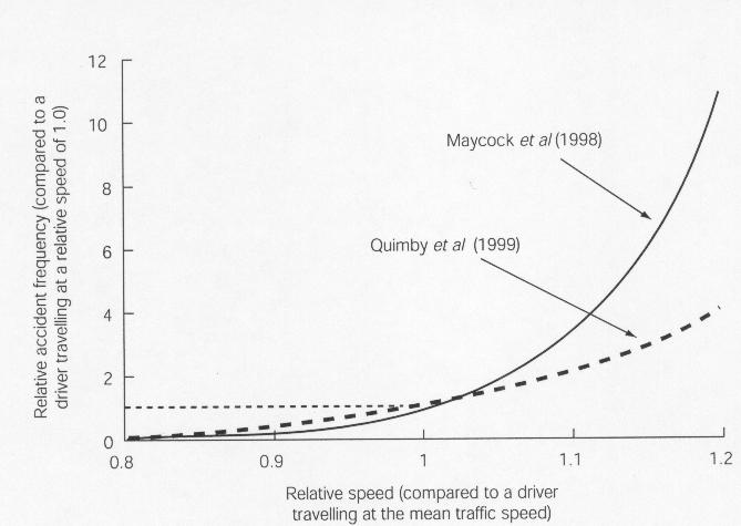 Fig 2 : c'est une approche originale de la variation du risque exprimée en fonction de la vitesse d'un usager par rapport à la vitesse moyenne du trafic. Si un usager va 1,2 fois plus vite que la vitesse moyenne du trafic, l'accroissement du risque est proche d'un facteur 4 dans l'étude de Quimby et de 11 dans celle de Maycock.