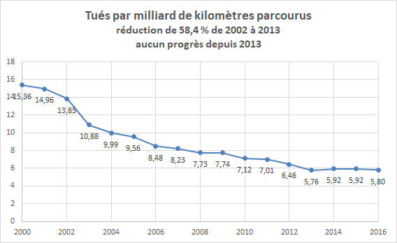 Nous n'avions pas connu de stagnation de la mortalité au kilomètre parcouru depuis la production de statistiques fiables concernant le trafic routier. Nous n'avions pas connu d'inversion de la mortalité dans un sens défavorable pendant trois années consécutives depuis 45 ans.