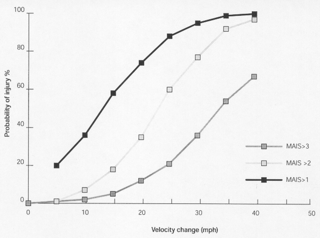 Fig 3. Ce graphique est un classique de l'accidentologie, il exprime le risque de subir des blessures d'un certain niveau de gravité en fonction de la variation de vitesse lors de l'impact subi par l'occupant d'un véhicule léger (se reporter au lexique du site pour la définition de la variation de vitesse). Le MAIS est le niveau maximal de l'indice AIS observé dans un secteur corporel quelconque.