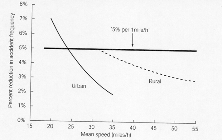 Fig 1 : sur l'axe horizontal la variable est la vitesse moyenne des véhicules, l'axe vertical indique une variation de fréquence des accidents pour une réduction d'un mile par heure de la vitesse en fonction de la vitesse moyenne. La ligne horizontale tracée au niveau de la réduction de 5% des risques d'accident pour une telle réduction de vitesse indique que ce niveau de réduction est obtenu à un niveau de vitesse moyenne plus bas en ville qu'en dehors des agglomérations. Si une telle courbe était tracée pour le milieu autoroutier elles serait encore décalée vers la droite.