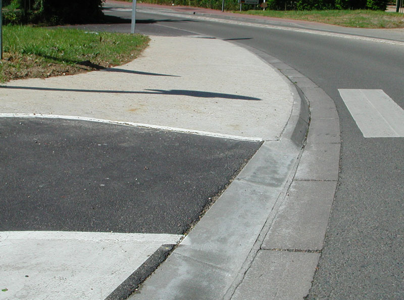 Raccordement sans dénivelée entre la piste et la chaussée au niveau d'une intersection. Piste à St Nom la Bretèche (PC9A). Le passage se fait sans secousse et sans risque de dérapage, même si la piste est prise obliquement. La pente permet l'écoulement des eaux vers le caniveau.